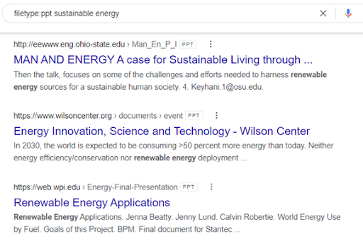 În cazul în care vrei să găsești un PowerPoint despre energia sustenabilă, poți folosi următoarea funcție în bara de căutări: filetype:ppt energie sustenabilă