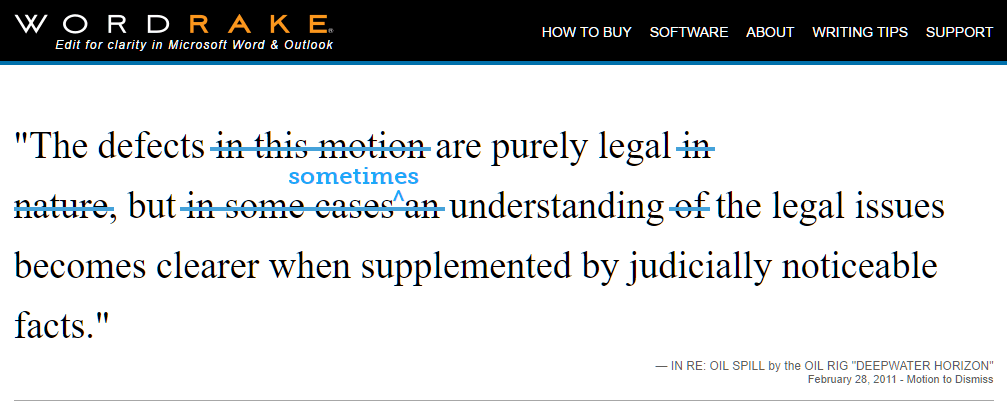 WordRake este un software de corectat texte, care poate fi integrat in Microsoft Word si Outlook. Acest soft este special conceput pentru avocati, iar la inceputul lunii noiembrie a fost lansata a 3-a versiune, care ofera o corectura cu 25% mai buna decat versiunea anterioara. Acest software este foarte usor de folosit. Printr-un singur click poti verifica textul respectiv. Unde va fi nevoie vei primi sugestii, pe care tu decizi daca le vei accepta.